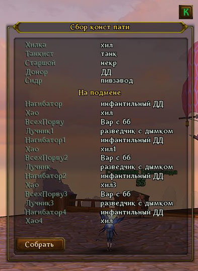 5. Это сбор КОНСТ пати т.е. все заранее обговорено в голосе, группа примерно всегда одинаковая. Чтобы не тыкать каждого, не искать его в гильдии или френд листе. Запускаешь - "Собрать" и всем пятерым приходит приглашение в группу.